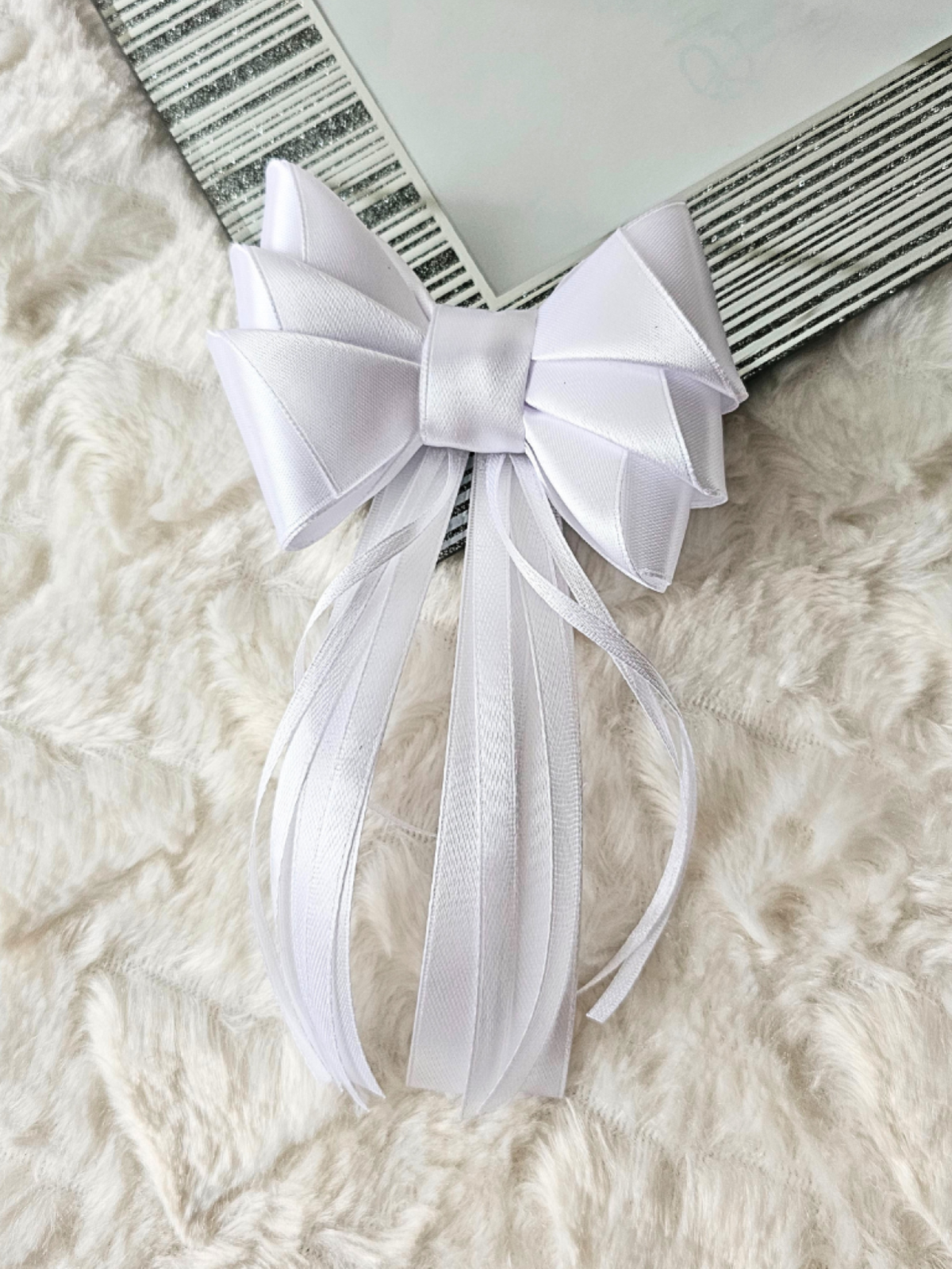 Elegancka komunijna kokarda–spinka do włosów w klasycznym białym kolorze. Delikatne wstążki i staranne wykonanie sprawiają, że pięknie dopełnia fryzurę, dodając jej subtelności i uroczystego charakteru.